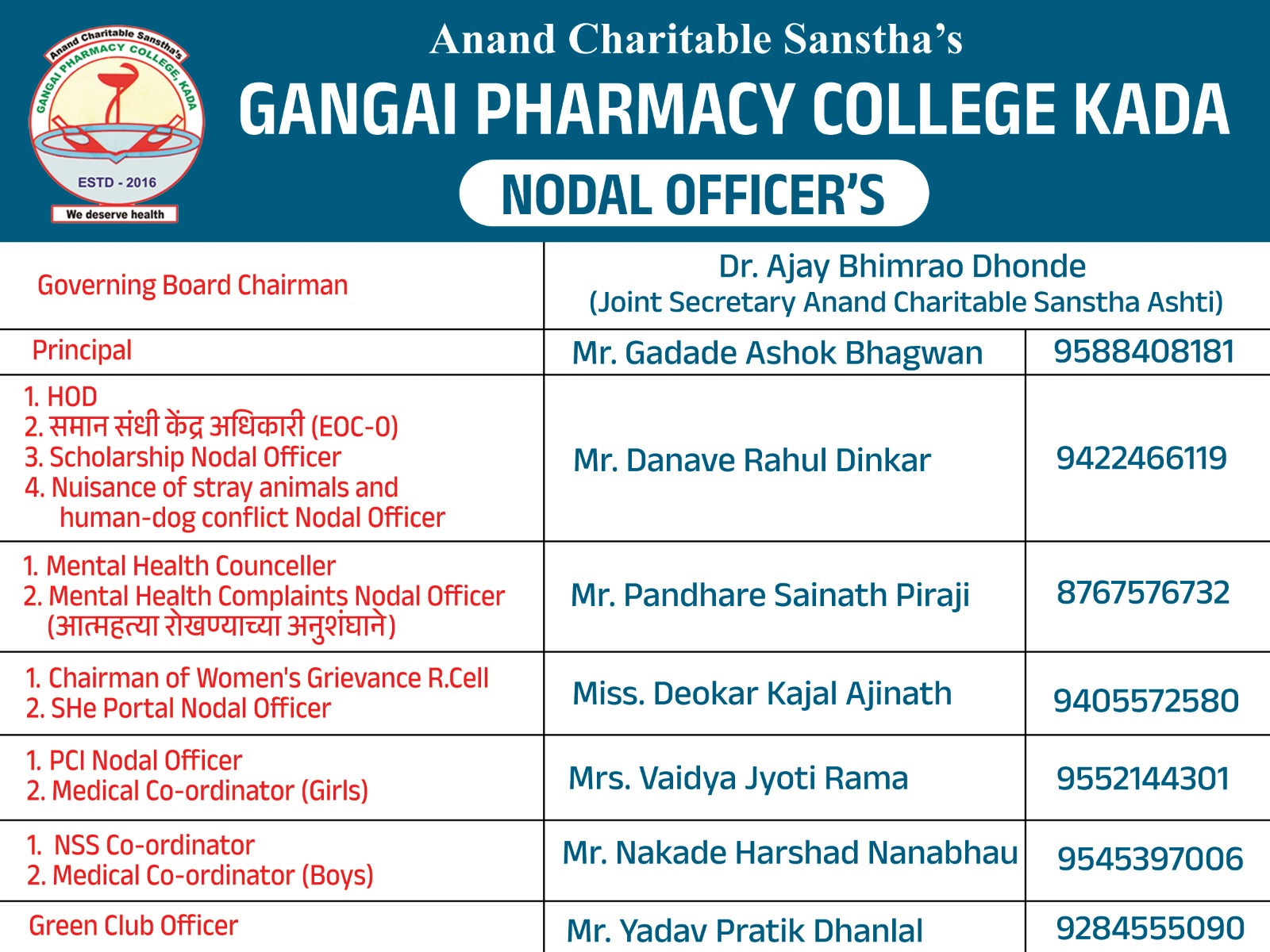 | 1 | Dr. Ajay Bhimrao Dhonde | Joint Secretary Anand Charitable Sanstha Ashti | Chairman |